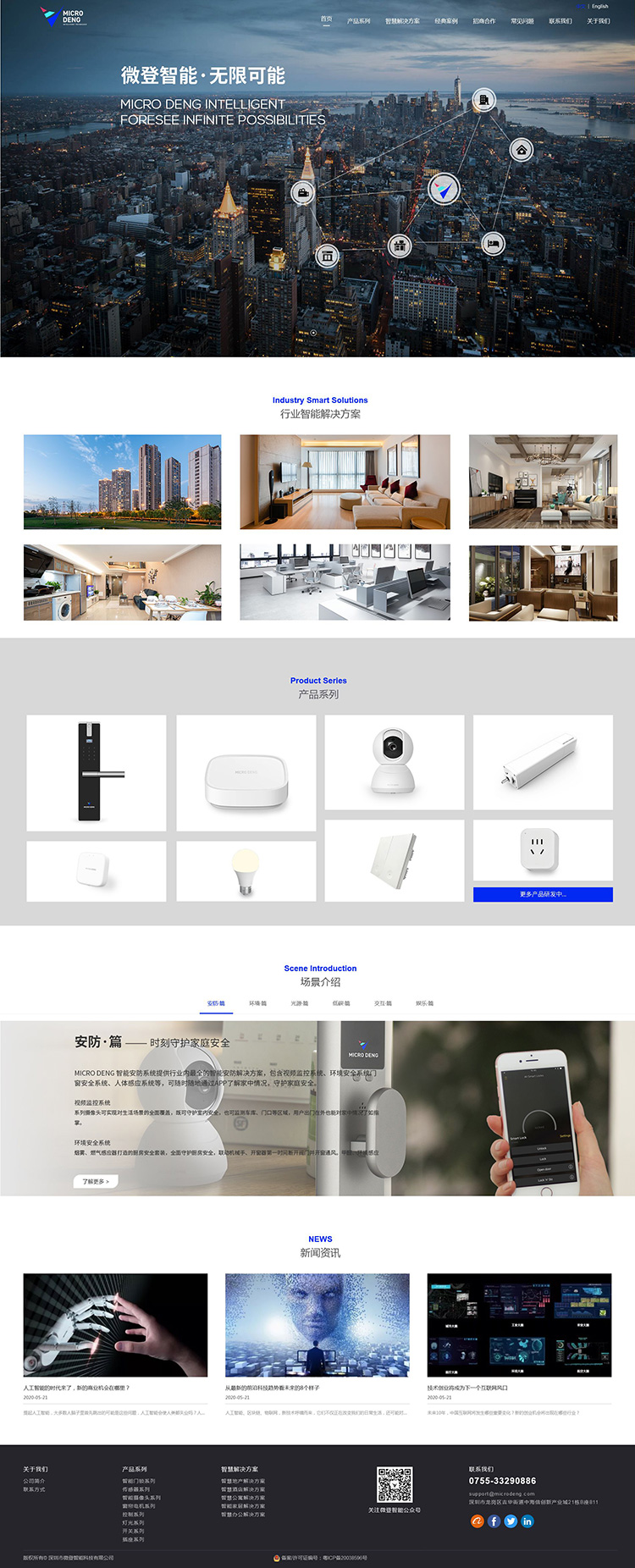 H5响应式企业网站定制,自适应电脑、平板、手机、微信,整个网站规划了首页、产品系列、智慧解决方案、经典案例、招商合作、常见问题、联系我们、关于我们等栏目页面,后期也可以通过后台进行编辑修改、新增页面,涵盖企业官网建设标准功能服务,适合于智能家居等行业网站建设。