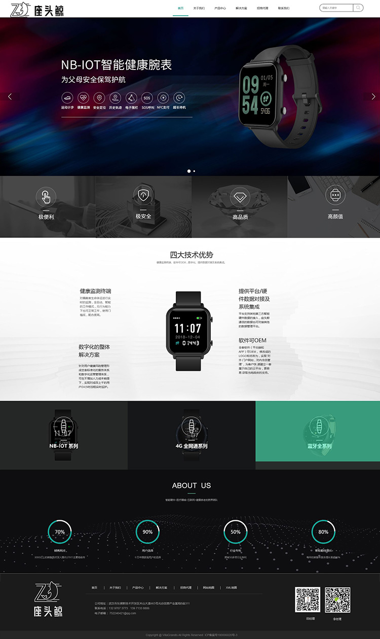 H5响应式企业网站定制,自适应电脑、平板、手机、微信,整个网站规划了首页、关于我们、产品中心、解决方案、招商代理、联系我们等栏目页面,后期也可以通过后台进行编辑修改、新增页面,涵盖企业官网建设标准功能服务,适合于智能穿戴、智能设备等行业网站建设。