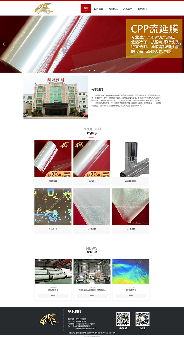 H5响应式企业网站定制,自适应电脑、平板、手机、微信,整个网站规划了首页、公司概况、新闻动态、产品展示、联系我们等栏目页面,后期也可以通过后台进行编辑修改、新增页面,涵盖企业官网建设标准功能服务,适合于包装材料、PE薄膜等行业网站建设。