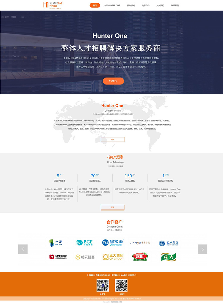 H5响应式企业网站定制,自适应电脑、平板、手机、微信,整个网站规划了首页、选择HUNTER ONE、服务领域、关于我们、加入我们、联系我们等栏目页面,后期也可以通过后台进行编辑修改、新增页面,涵盖企业官网建设标准功能服务,适合于招聘、人力资源等行业网站建设。